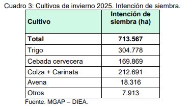 La intención de siembra de los cultivos de invierno para grano seco se estimó en 713.567 hectáreas, unas 49.000 hectáreas menos que en el invierno anterior cuando se sembraron 759.000 hectáreas, según la DIEA. La intención de siembra para el trigo se estimó en 304.778 hectáreas, mientras que colza y carinata llegarían a 213 mil ha, y para la cebada la intención declarada los productores se estimó en 170 mil hectáreas.