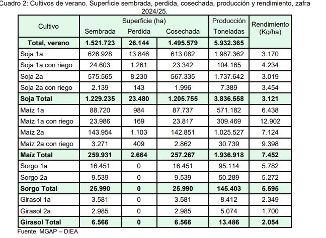 El rendimiento promedio estimado para la soja fue de 3.121 kilogramos por hectárea, valor máximo registrado para el cultivo en el Uruguay, dando como resultado una producción total para la cosecha 2024/25 de 3.836.558 toneladas, récord histórico.