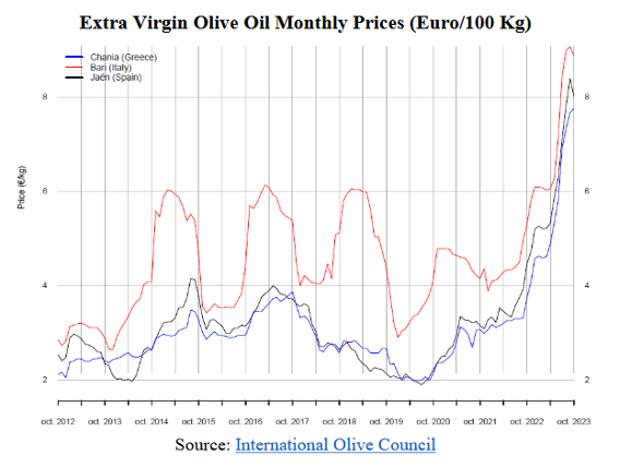 En España, que produce aproximadamente la mitad de la cosecha de aceitunas del mundo, las condiciones climáticas extremas provocaron una escasez de producción por segundo año consecutivo. Después de que una ola de calor primaveral afectara la floración, se pronosticaba que la cosecha en España sería sólo 15% mayor que la del año pasado, que fue el peor año de producción de aceite de oliva en casi una década.