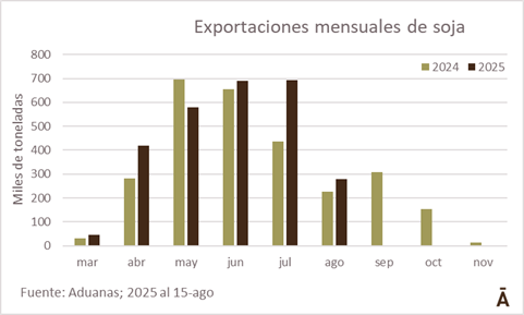 Los datos de Aduanas hasta mediados de agosto dan cuenta de exportaciones uruguayas de soja de 2,70 millones de toneladas, unas 480 mil toneladas más que lo embarcado a la misma fecha en 2024. El valor medio FOB del período es de US$/t 391, 10% inferior a los US$/t 435 que promediaba hasta esa fecha el año pasado.