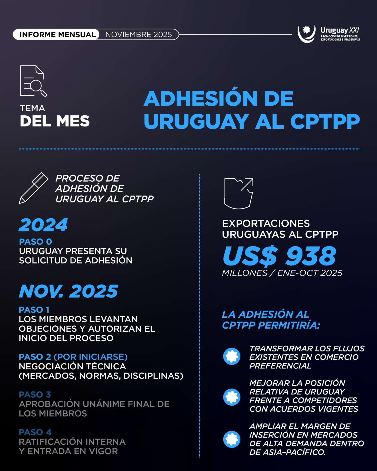 La decisión de los países miembros del Tratado Integral y Progresivo de Asociación Transpacífico (CPTPP) de aceptar la solicitud de adhesión de Uruguay, abre una oportunidad importante para la estrategia uruguaya de integración internacional, destacó Uruguay XXI en su informe de comercio exterior de noviembre.