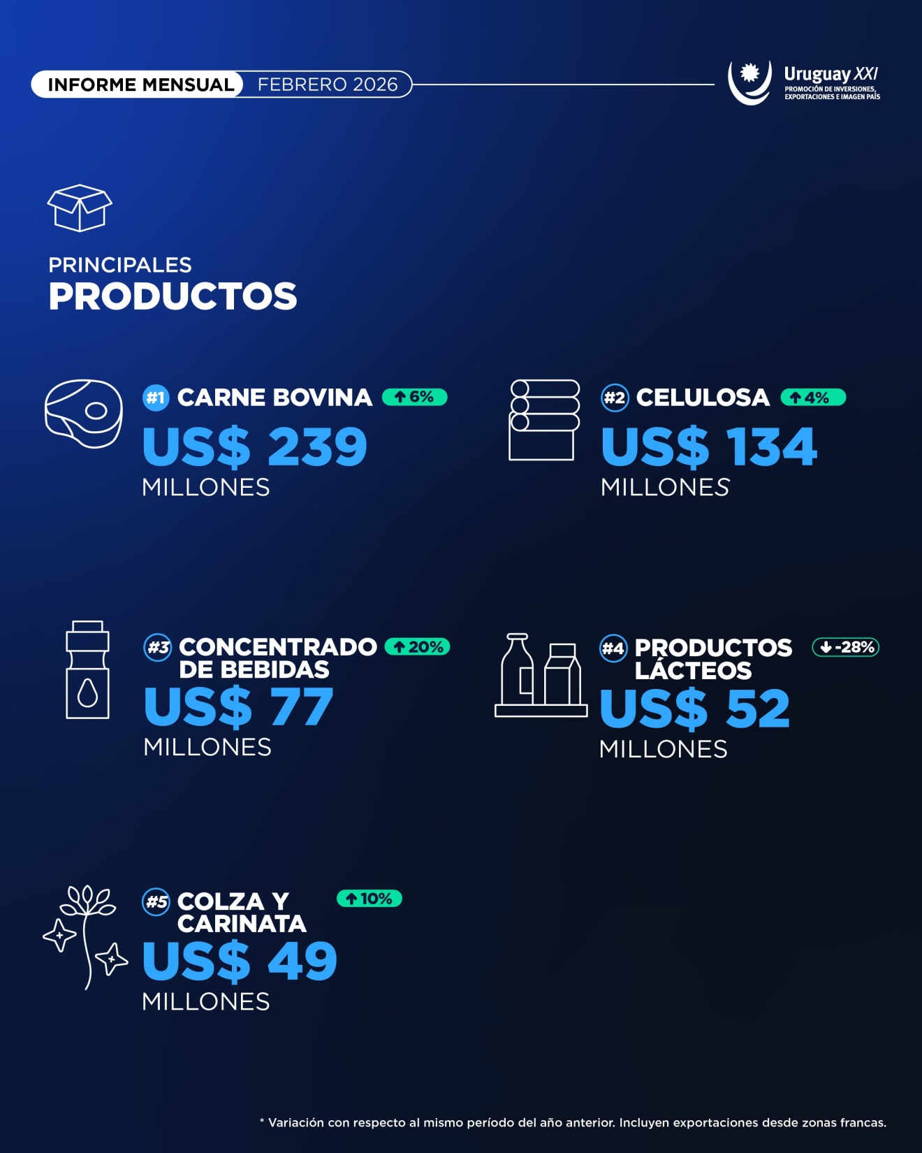 Las exportaciones totales (incluyendo zonas francas) alcanzaron los US$ 1.025 millones, lo que representa un aumento interanual del 9% respecto a febrero de 2025. En el primer bimestre del año, las ventas al exterior sumaron US$ 1.989 millones, marcando un crecimiento del 8% en comparación con el mismo período del año anterior, informó Uruguay XXI este lunes.