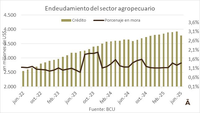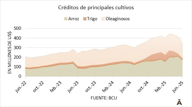 En lo que respecta al sector agrícola, también se produjo un descenso al cierre del primer semestre de 2025. Este sector tenía créditos con los bancos por US$ 356 millones, una baja apreciable versus los US$ 418 de mayo. La cartera de créditos en mora es baja, 2% del total (unos US$ 8 millones).