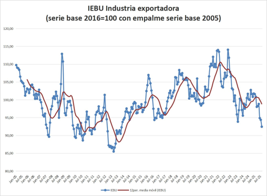 “El BCU actualizó el IEBU a agosto de 2025, el indicador de rentabilidad por excelencia de la industria exportadora. El mismo muestra una caída del margen bruto (antes de impuestos) de 7,5% vs agosto 2024 y una caída sistemática en lo que corre de 2025”, advirtió en su cuenta de X el economista privado José Licandro.