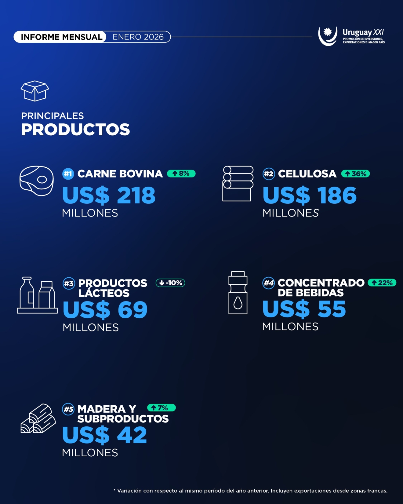 Las solicitudes de exportación alcanzaron US$ 995 millones en enero de 2026 y marcaron un incremento interanual de 9%. La carne bovina fue el principal producto del mes, con ventas por US$ 218 millones (+8% interanual). En segundo lugar se ubicó la celulosa, con US$ 186 millones, y los productos lácteos ocuparon el tercer lugar, con US$ 69 millones, informó Uruguay XXI.