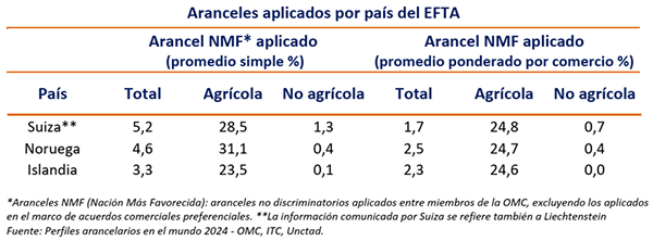 Mercosur y EFTA se otorgarían concesiones en materia de acceso de bienes para aproximadamente el 97% del comercio birregional. Cabe resaltar que, si bien los países de EFTA negocian conjuntamente, sus ofertas de bienes, servicios y compras gubernamentales son individuales. La estructura arancelaria de los países de EFTA demuestra la elevada protección del sector agrícola y agroindustrial.