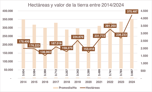 En cuanto al valor de estas transacciones, el precio promedio por hectárea alcanzó los US$ 3.967, un 4,8% por encima de la referencia registrada en 2023, y superó así la marca histórica anterior del 2014 de US$/ha 3.934.