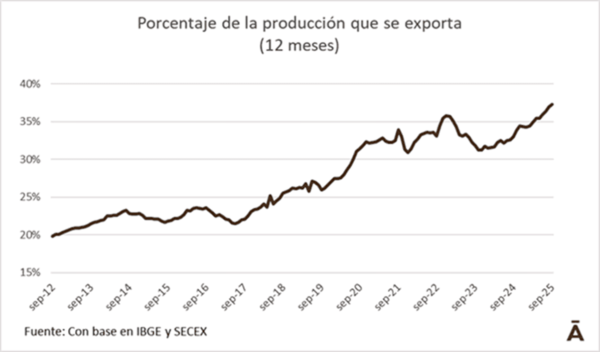 El peso relativo de la exportación respecto a la producción total de carne vacuna sigue creciendo en Brasil. En los 12 meses cerrados en setiembre, Brasil produjo 10,63 millones de toneladas carcasa de carne vacuna. De ese total, exportó 3,97 millones de toneladas, equivalente a 37,3% de la producción, proporción a la que la exportación nunca había llegado.