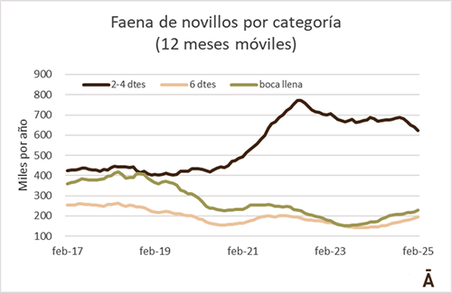 Se estima que la edad media de faena de novillos tocó un piso histórico a mediados de 2023, con un promedio de menos de 30 meses. Desde entonces la tendencia se revirtió y en los 12 meses a febrero de 2025 la edad promedio se estima en casi 31 meses. Hubo un descenso en la faena de novillos de 2-4 dientes y un aumento de los de 6 dientes y en los boca llena.