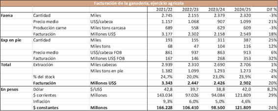 Considerando un stock de 11,32 millones de vacunos al inicio del ejercicio, la tasa de extracción fue de 23,9%, la segunda más alta de la historia, solamente por detrás del 24,7% del ejercicio 2021/22.