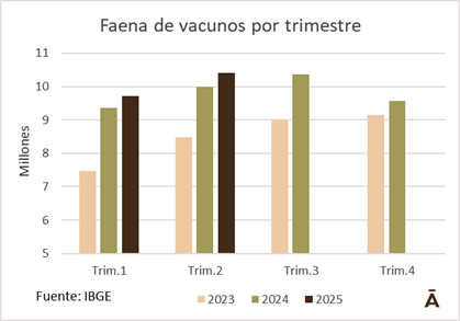 La faena de ganado vacuno creció 3,3% en el segundo trimestre de 2025 en comparación con el mismo período de 2024 y 5,4% respecto al primer trimestre de 2025, alcanzando 10,40 millones de cabezas, informó el Instituto Brasileño de Geografía y Estadística (IBGE) al dar a conocer los resultados primarios del período. Este resultado representa la producción de 2,63 millones de toneladas de carne vacuna peso carcasa, un aumento anual de 1,0% y de 6,0% en comparación con el primer trimestre de 2025.