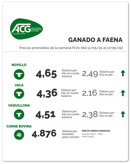 Fue otra semana de firmeza para el mercado de hacienda en la semana cerrada al 17 de mayo. De acuerdo a la reunión de precios de la ACG de este lunes, los novillos hicieron un promedio de US$ 4,65 por kg a la carne (+4 cents), las vacas gordas de US$ 4,36 (+3 cents), y las vaquillonas de US$ 4,51 (+4 cents). “Buena demanda; entradas más ágiles. Mercado firme”, dijeron los consignatarios en su comentario. Los novillos especiales de exportación se negociaron a una media de US$ 4,71 por kg a la carne (+4 cents).