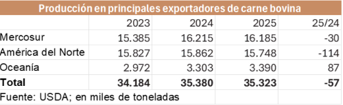 En conjunto, la producción de carne vacuna en las principales regiones productoras del mundo (países del Mercosur en Sudamérica, América del Norte y Oceanía) se proyecta con una caída de 57 mil toneladas, hasta 35,3 millones de toneladas, ya que la menor producción en América del Norte (-137 mil toneladas) y en el Mercosur (-30 mil toneladas) será parcialmente compensada por un incremento de 87 mil toneladas en Oceanía.