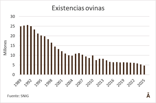 En lo que refiere a ovinos, la majada cayó a 4,752 millones de cabezas, un descenso anual de 616 mil cabezas (11,5%), por debajo de los 5 millones por primera vez desde que se llevan registros.