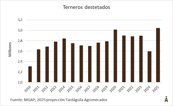 Los datos oficiales de existencias vacunas dan cuenta de 11,455 millones de vacunos, con un moderado crecimiento respecto al mismo día de 2024 de 1,2% (133 mil cabezas). Los terneros contabilizados sumaron 3,039 millones, superando el anterior máximo histórico de 2020, cuando ascendieron a 3,015 millones, aunque algo por debajo de las expectativas que eran de que se superaran los 3,1 millones.