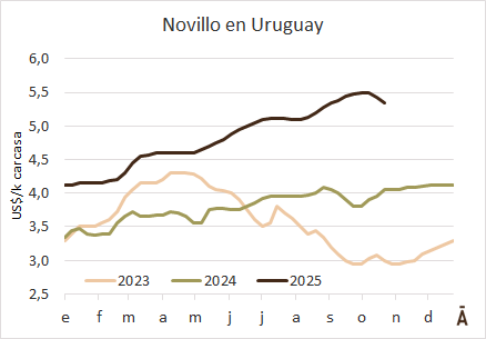 Los operadores consultados ayer dijeron que los US$ 5,40 por novillos ya no están más en el mercado. Hay plantas que ofrecen US$ 5,30-5,35 y otras se posicionan tan abajo como US$ 5,20 el kilo.