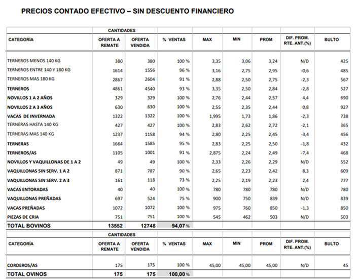 El consorcio Pantalla Uruguay cerró este miércoles su remate 292 en el marco de la Ganadera Hereford con un 94% de ventas (12.748 vacunos comercializados). La categoría de terneros (4.861) se vendió en un 93% e hizo promedio general de US$ 2,84 por kg en pie (US$ 527 al bulto), en baja de 2,8% versus el primer remate de abril, mientras que los novillos de 1 a 2 años se valorizaron 4,4% a US$ 2,57 por kg.