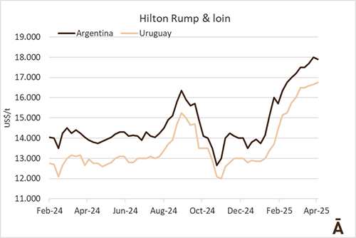 El mercado de importación en EEUU está mostrando “dos caras”, según dijo esta semana a World Beef Report (WBR) un trader. Por un lado, todo lo que son programas de carne grassfed u orgánico retomó su flujo habitual tras los aranceles de Trump, donde los importadores asumieron el 10% o incluso, producto de la mejora reciente en China, están dispuestos a pagar algo más. Por ejemplo, hubo cierres de bola de lomo grassfed desde la región a US$/t 6.500-6.700 FOB por fuera cuota (paga arancel de 36,4%). En cambio, todo el negocio de manufactura o bloques del delantero “está mucho más pesado. No es que quieran pagar menos, sino que directamente hay muy poco interés en comprar”, resumió la fuente. Esto está vinculado a los dolores de cabeza y ajustes logísticos y comerciales que está implicando el ingreso de carne con costos adicionales para distintos proveedores.