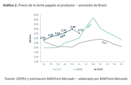 Según MilkPoint, los precios de la leche al productor en junio (por la leche recolectada en mayo) deberían mostrar una caída de aproximadamente 18 centavos por litro, retrocediendo al nivel promedio estimado de R$ R$ 2,72 (unos US$ 0,57), en el promedio de CEPEA para todo Brasil, todavía unos 20 céntimos/litro por encima de los precios deflactados de igual mes de 2022.