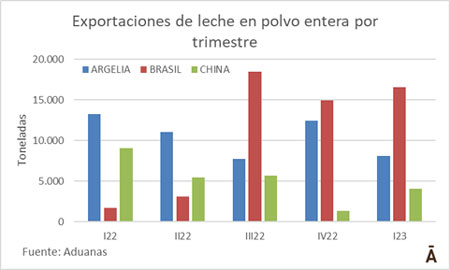 La dispar condición del mercado internacional y regional está redireccionando las exportaciones uruguayas de leche en polvo entera, el principal producto lácteo que el país coloca en el mercado internacional. Uruguay está dejando en un segundo plano las colocaciones en los demás destinos (fundamentalmente Argelia y China) y se está enfocando en el abastecimiento de la plaza brasileña.