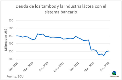 Considerado el total de la cadena láctea (industria + tambos), los préstamos totalizaban unos US$ 353 millones al cierre de setiembre, con un porcentaje de créditos vencidos de 2,4% del total (US$ 8,5 millones). En setiembre de 2021, la deuda de la cadena llegaba a los US$ 438 millones y el volumen de préstamos vencidos llegaba al 5,8% del total (unos US$ 26 millones).