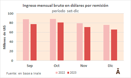 Los ingresos brutos en dólares corrientes (sin descontar la inflación) que percibieron los tambos por su remisión de leche a plantas industriales totalizaron US$ 848 millones en 2023 y se redujeron en unos US$ 21 millones (-2,4%) respecto al máximo de US$ 869 millones en ocho años que se había registrado en 2022. El incremento en los niveles de remisión (+1,2% anual) no fue suficiente para compensar la (fuerte) baja en el precio de la leche que se dio en el segundo semestre del año pasado.