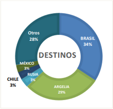 En el último año móvil, Brasil fue el principal destino para todos los productos lácteos (34%), seguido por Argelia (29%), mientras que Chile, Rusia y México comparten un 3% cada uno.