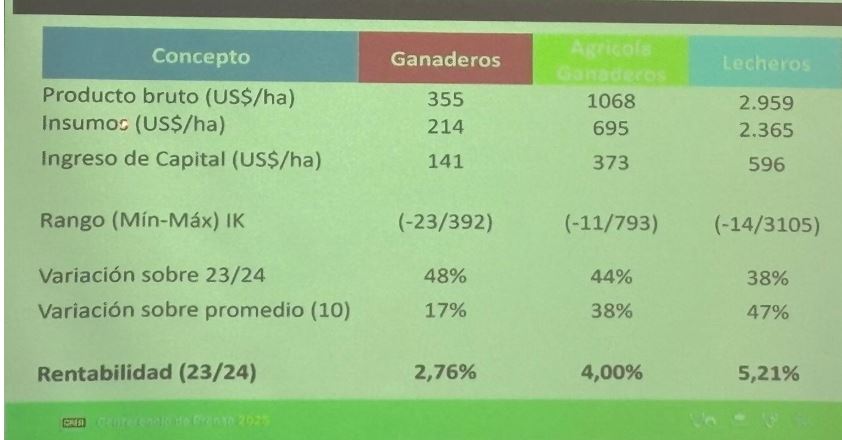 Según la tabla comentada durante la presentación, los productores lecheros registraron una rentabilidad promedio de 5,21% (+38% versus el ejercicio anterior), con un producto bruto de US$/ha 2.959. En comparación, los sistemas agrícola-ganaderos se ubicaron con una rentabilidad promedio del 4% (+44%), y los ganaderos del 2,76% (+48%).