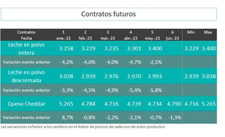 El precio medio de la leche en polvo entera (LPE) se ubicó en US$/ton 3.246, en baja de 4% respecto al evento anterior. La descremada cayó 4,8%, a US$/ton 2.965, la manteca (-2,6%) a US$/ton 4.602, y el queso cheddar (-0,7%) a US$/ton 4.801.