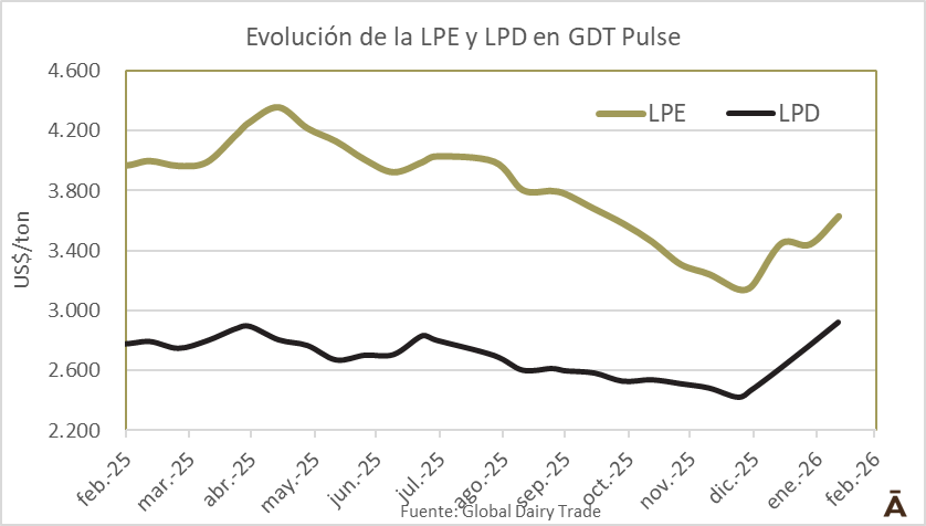 En la subasta GDT Pulse, el precio medio a la tonelada de la leche en polvo entera se ubicó en US$/t 3.629, un avance de 5,4% versus el remate del pasado 27 de enero. Además, se trató del mayor valor en este tipo de subasta desde el pasado 14 de octubre. En el remate tradicional de GDT, del pasado 3 de febrero, la LPE había cerrado a US$/t 3.614 de promedio.