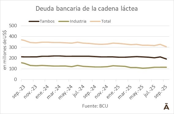 Tomando el conjunto de la cadena láctea (industria + tambos), el endeudamiento con los bancos ronda los US$ 306 millones, unos US$ 25 millones menos que un año atrás.