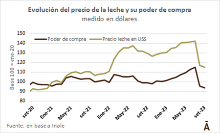 De acuerdo al Inale, el índice quedó con un valor de 72 en setiembre, en baja de 2% respecto a agosto (74), valor que está 28% por debajo del año base marzo 2014=100. Además, para encontrar un nivel tan bajo del poder de compra de leche medido en pesos hay que remontarse a marzo de 2019 (72). En dólares, el poder de compra de la leche está en 80, su menor nivel desde enero de 2022.