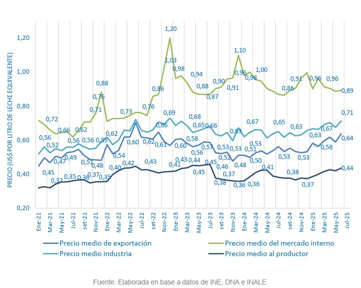 El precio recibido por la industria láctea en dólares de junio aumentó 12% respecto al mismo mes de 2024 dado por un aumento del precio de exportación de 19%, según el Inale.En junio de 2025, el precio promedio recibido por la industria por leche exportada fue de US$ 0,64 por litro equivalente, lo que implica un aumento del del 20% en comparación con diciembre de 2024. Además, se trata del mayor valor de los últimos cuatro años.