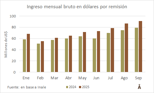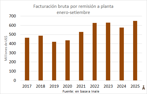 En el parcial de enero-setiembre, la facturación bruta por la remisión a planta totalizó US$ 650 millones, un aumento del 13% (US$ 75 millones) versus igual período del año pasado (US$ 575 millones).