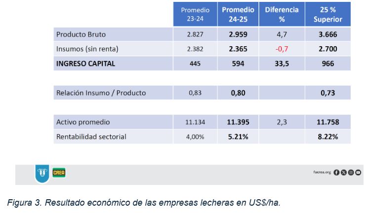Las empresas del cuartil superior sí lograron aumentar la producción, principalmente a través de un incremento en la carga (vacas masa por hectárea de SPL). A pesar de tener mayores costos de alimentación, alcanzaron un ingreso de capital de US$/ha 966, un 33,5% por encima del promedio.