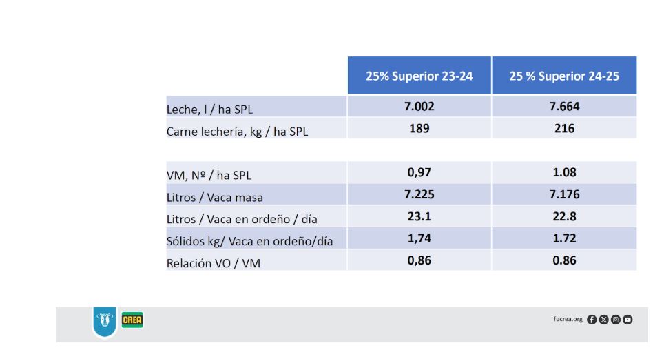 En términos productivos, la producción fue prácticamente idéntica a la del ejercicio pasado: 6.209 l/ha SPL, frente a 6.211 l/ha SPL en 2023/24. Esto implica que el incremento económico proviene casi exclusivamente del precio de la leche.