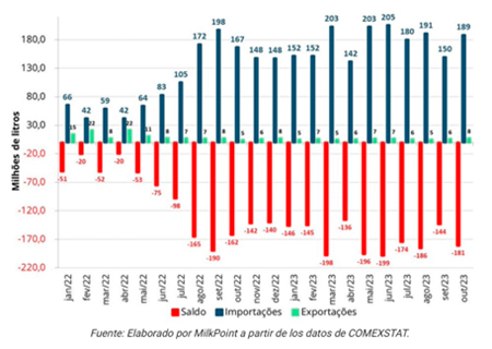 Para el mes de octubre, el saldo de la balanza comercial de lácteos de Brasil volvió a ser más negativo en comparación con el mes anterior. Según datos publicados por la Secretaría de Comercio Exterior (SECEX), el saldo registrado en el último mes alcanzó los -181 millones de litros en equivalente-leche, un aumento de 37 millones respecto a septiembre de 2023 (-144 millones de litros).