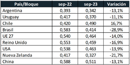 De acuerdo a un comparativo de precio que publicó OCLA, Brasil (-28,9%) y Nueva Zelanda (-21,7%) fueron los países donde porcentualmente se dieron las mayores bajas en el precio de la leche al productor al comprar setiembre de este año con igual mes de 2022 medido en dólares corrientes, al tiempo que Uruguay fue de los países donde menos lo hizo (-11,1%). Algo atípico ocurrió en Chile, donde el precio al productor aumentó 16,7%.