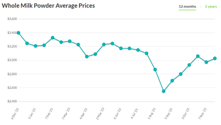 El valor promedio para la leche en polvo entera (LPE) fue de US$ 3.027 por tonelada en esta licitación y marcó una recuperación del 1,9% respecto a la venta anterior. Los contratos de LPE cotizaron en suba entre diciembre (2%) a febrero (1,5%), en tanto que los contratos de marzo (-1,4%) y abril (-0,2%) cerraron en baja. El único oferente de este producto fue Fonterra.
