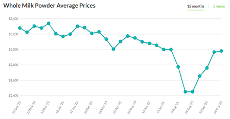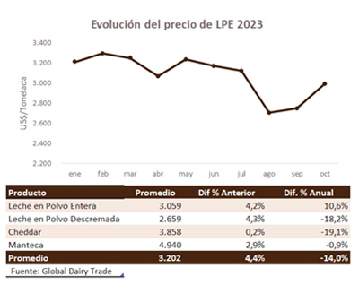 El promedio general de la plataforma de subastas de Fonterra cerró en U$S 3.202 por tonelada, un 4,3% superior a la primera licitación del mes, sin embargo, aún se encuentra un 14% por debajo del promedio alcanzando en igual venta de 2022.