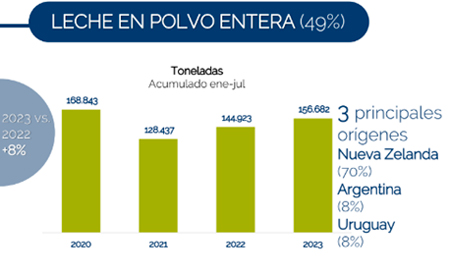 Las exportaciones de productos lácteos de Uruguay en volumen físico en el acumulado del período enero-setiembre han acentuado el liderazgo y la participación de la leche en polvo entera con ventas por 116.202 toneladas, un 15% más que igual período del año pasado, según el informe en base a Aduanas que divulgó el Inale. En contrapartida, hubo bajas pronunciadas en las ventas de leche en polvo descremada (-57%, a 8.546 toneladas), manteca (-40%, a 7.351 tons), y quesos (-10%, a 16.037 tons).