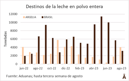 Brasil dejó de ser virtualmente hegemónico en los embarques de leche en polvo entera en agosto y resurgió Argelia, uno de los destinos tradicionales para la industria láctea uruguaya.
