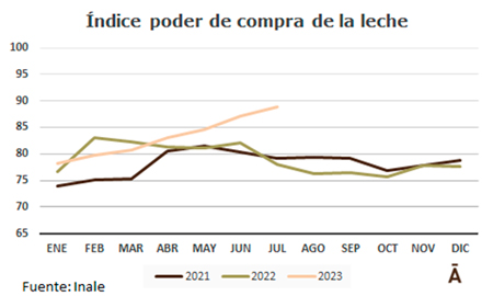 El índice de Poder de Compra de la leche llegó a un valor de 89 en julio y alcanzó su mayor nivel en 9 años. Para encontrar un nivel de ese indicador por encima de ese umbral hay que remontarse a agosto de 2014 (91). De todas formas, el índice cerró julio un 11% por debajo del año base marzo 2014=100.