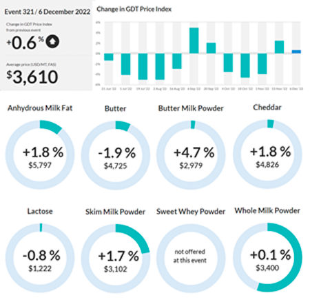 La plataforma electrónica Global Dairy Trade (GDT) realizó este martes su primera licitación de productos lácteos del mes de diciembre, la número 321, donde el promedio de los productos lácteos subió un 0,6% sobre el incremento registrado ya en el evento anterior.