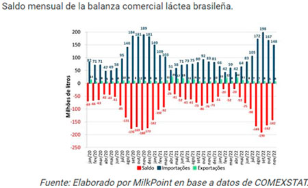 Según datos difundidos por la Secretaría de Comercio Exterior (SECEX), la balanza comercial de productos lácteos de Brasil fue de aproximadamente -142,1 millones de litros de equivalente de leche en noviembre, un aumento de 20,1 millones, o aproximadamente 12,4% en comparación con el mes anterior.