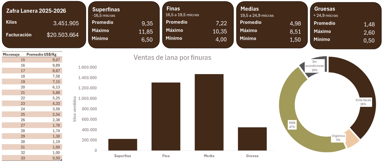 La actual zafra lanera 2025/2026, lleva acumulado un total de 3.451.905 kilos de lana entre julio de 2025 y febrero de este año, registrándose así una facturación de US$ 20.503.664, según la información brindada por productores, consignatarios y representantes de las industrias, tanto al Secretariado Uruguayo de la Lana (SUL) y al Faxlana, semana a semana.