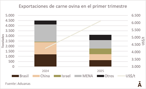 Las exportaciones uruguayas de carne ovina en el primer trimestre del año sufrieron cambios drásticos tanto en el volumen como en el valor medio. El volumen cayó 31% en la comparación anual a 3.100 toneladas, en tanto que el valor medio aumentó 44% a US$ 6.116 por tonelada peso embarque. Con ello, la facturación se mantuvo en niveles muy similares en el eje de los US$ 19 millones.