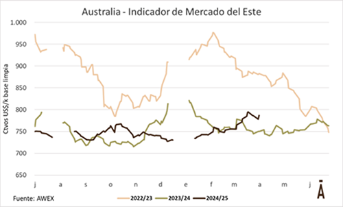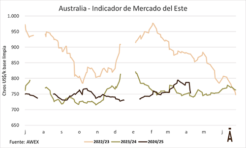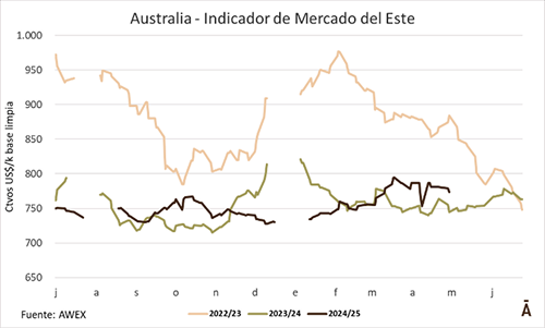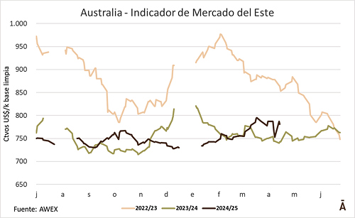 Luego de dos semanas de alta variabilidad en las monedas, generando subas y bajas importantes en ambas monedas, el mercado lanero australiano entró en el receso de Pascuas, retomando su actividad la próxima semana. El pasado miércoles 23, el Indicador de Mercados del Este (IME) cerró en AU$ 12,32 por kilogramo base limpia, con una caída semanal del 2,4%. A pesar de la caída en los valores en la semana anterior, en el acumulado de la presente zafra el indicador registrado una suba del 7,9%.