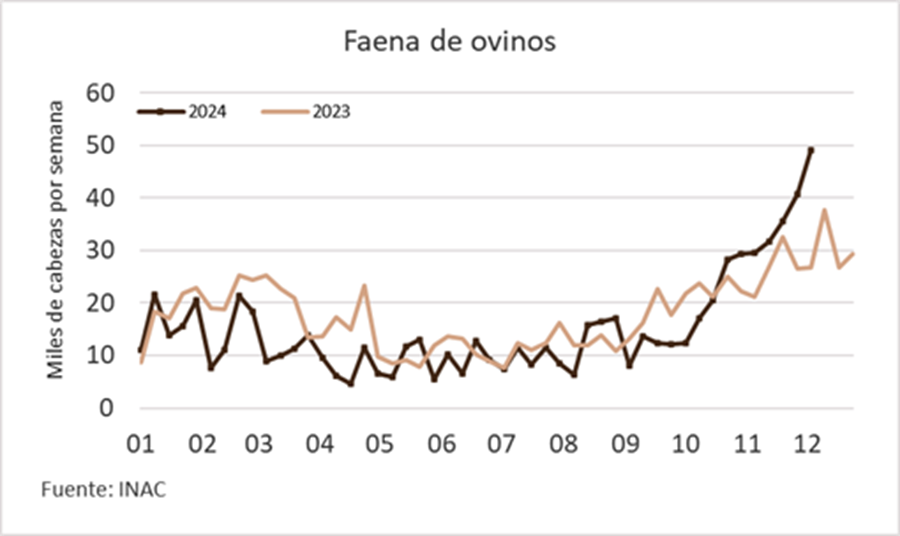 La faena de ovinos se arrimó a las 50 mil cabezas la semana pasada, un máximo desde la penúltima de 2022, tres años atrás. La concentración de San Jacinto en la actividad con ovinos, así como la operativa de Frigocerro para las exportaciones a Israel, se complementaron con una oferta que se ha concentrado en este último tramo del año.