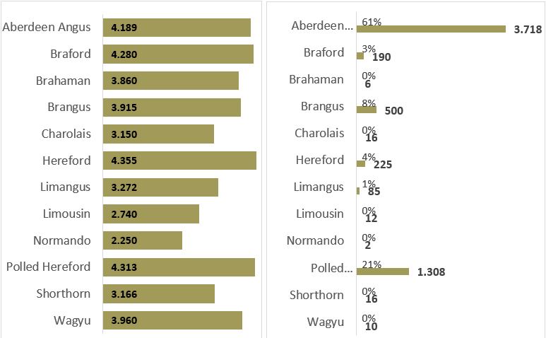 La raza Aberdeen Angus representó el 61% de los toros vendidos, mientras que los Hereford sumaron 25% y las razas sintéticas el 11% (Braford y Brangus). En las cuatro razas se han vendido más toros que el año pasado.